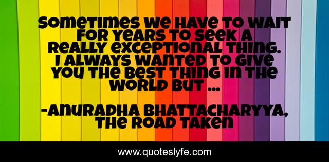 This page presents the quote "Sometimes we have to wait for years to seek a really exceptional thing. I always wanted to give you the best thing in the world but ...". Author of this quote is Anuradha Bhattacharyya, The Road Taken. This quote is about exception, best-inspirational, gift, exceptional, gifting, life, life-philosophy, excellence, love-story,.
