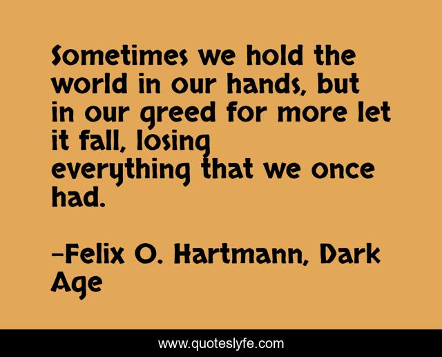 This page presents the quote "Sometimes we hold the world in our hands, but in our greed for more let it fall, losing everything that we once had.". Author of this quote is Felix O. Hartmann, Dark Age. This quote is about loss, self-awareness, affection, love, greed,.