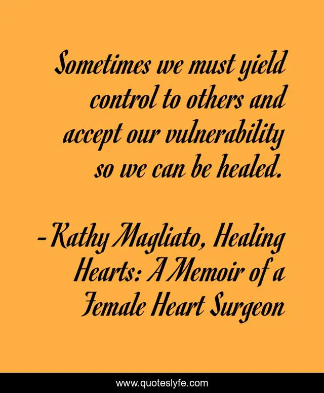 This page presents the quote "Sometimes we must yield control to others and accept our vulnerability so we can be healed.". Author of this quote is Kathy Magliato, Healing Hearts: A Memoir of a Female Heart Surgeon. This quote is about vulnerability, healing, help,.