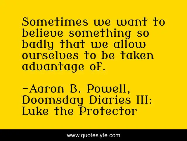 This page presents the quote "Sometimes we want to believe something so badly that we allow ourselves to be taken advantage of.". Author of this quote is Aaron B. Powell, Doomsday Diaries III: Luke the Protector. This quote is about conned, belief, advantage, believe, taken-advantage-of, take, allow, trust, ourselves,.