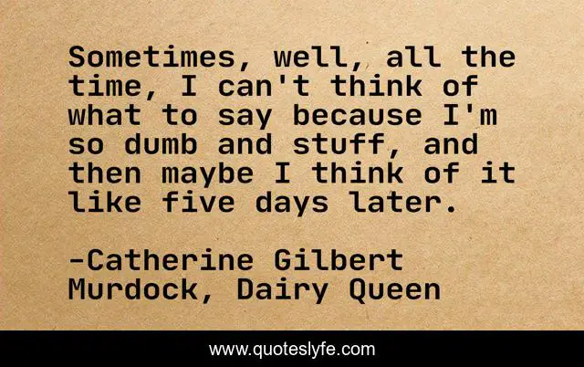 This page presents the quote "Sometimes, well, all the time, I can't think of what to say because I'm so dumb and stuff, and then maybe I think of it like five days later.". Author of this quote is Catherine Gilbert Murdock, Dairy Queen. .