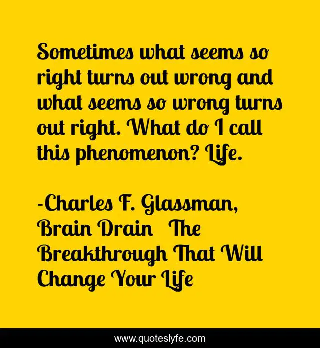 This page presents the quote "Sometimes what seems so right turns out wrong and what seems so wrong turns out right. What do I call this phenomenon? Life.". Author of this quote is Charles F. Glassman, Brain Drain The Breakthrough That Will Change Your Life. This quote is about perseverance, life, love, law-of-attraction, motivational, spiritual, patience, optimistic, inspirational,.
