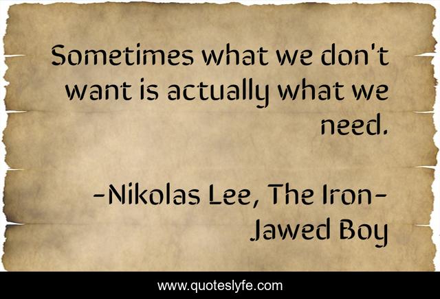 This page presents the quote "Sometimes what we don't want is actually what we need.". Author of this quote is Nikolas Lee, The Iron-Jawed Boy. This quote is about children, young-adult, childrens, fantasy-series, middle-grade, childrens-book, fiction, fantasy, young-adult-series,.