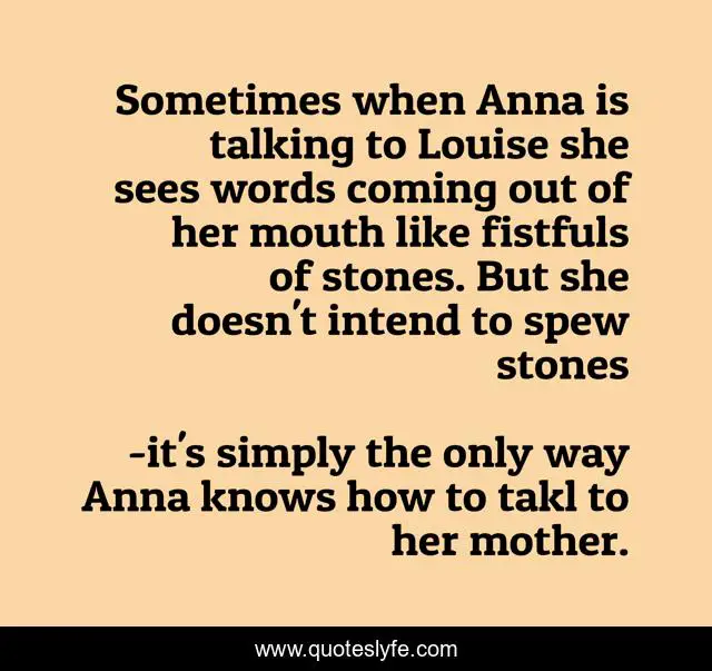 This page presents the quote "Sometimes when Anna is talking to Louise she sees words coming out of her mouth like fistfuls of stones. But she doesn't intend to spew stones". Author of this quote is it's simply the only way Anna knows how to takl to her mother.. .