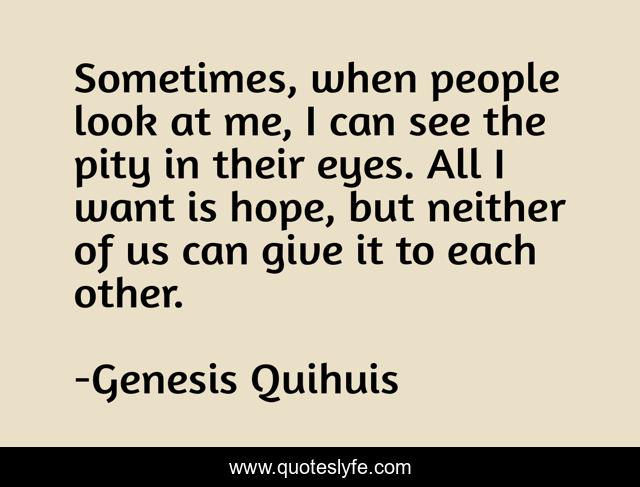 This page presents the quote "Sometimes, when people look at me, I can see the pity in their eyes. All I want is hope, but neither of us can give it to each other.". Author of this quote is Genesis Quihuis. This quote is about pity, life, hopelessness, hopeless, hope,.
