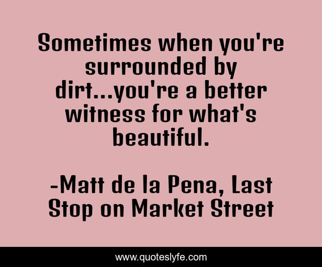 "Matt de la Pena, Last Stop on Market Street Quotes." Quoteslyfe.com, 2025. Fri. 05 Dec. 2025. <https://www.quoteslyfe.com/quote/Sometimes-when-you-re-surrounded-by-dirt-135220>.