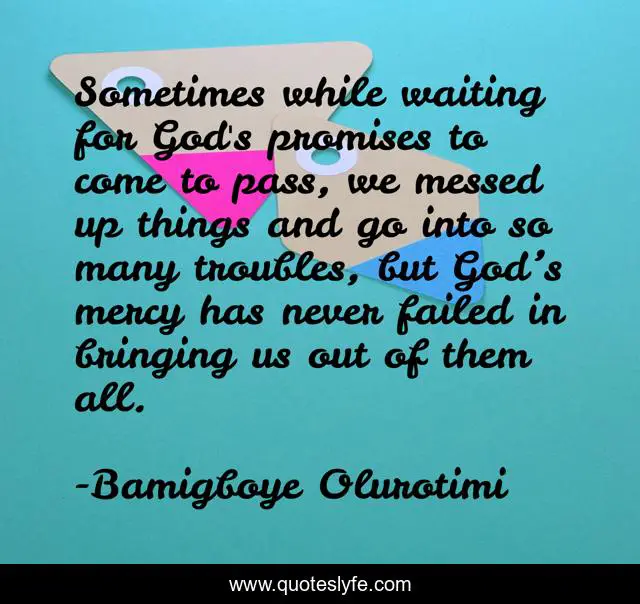 This page presents the quote "Sometimes while waiting for God's promises to come to pass, we messed up things and go into so many troubles, but God’s mercy has never failed in bringing us out of them all.". Author of this quote is Bamigboye Olurotimi. This quote is about promises, lack, shame, crises, obedience, crime, waiting, oppression, life,.