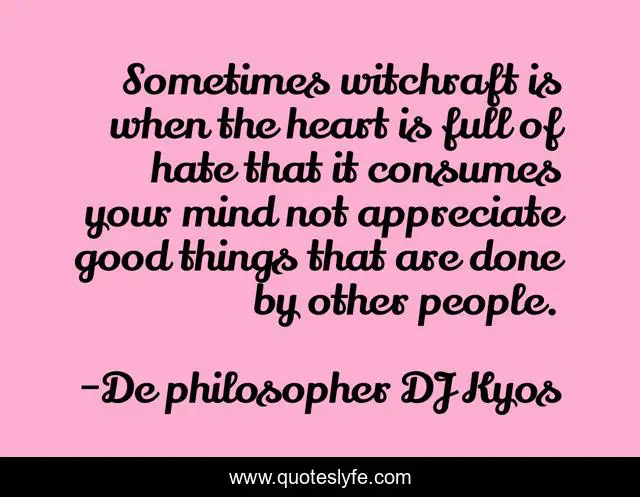 This page presents the quote "Sometimes witchraft is when the heart is full of hate that it consumes your mind not appreciate good things that are done by other people.". Author of this quote is De philosopher DJ Kyos. This quote is about motivation, love, witchcraft, friends, support, philosophy, quotes, affection, life-lessons,.
