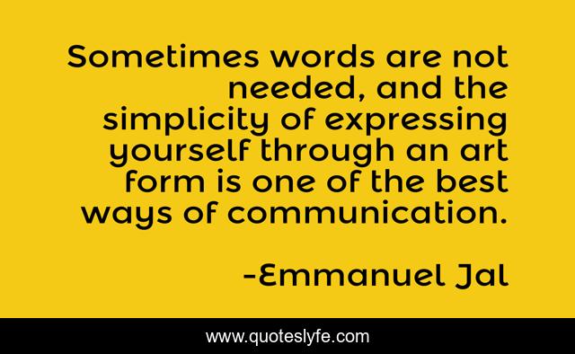 This page presents the quote "Sometimes words are not needed, and the simplicity of expressing yourself through an art form is one of the best ways of communication.". Author of this quote is Emmanuel Jal. This quote is about art, best, words,.