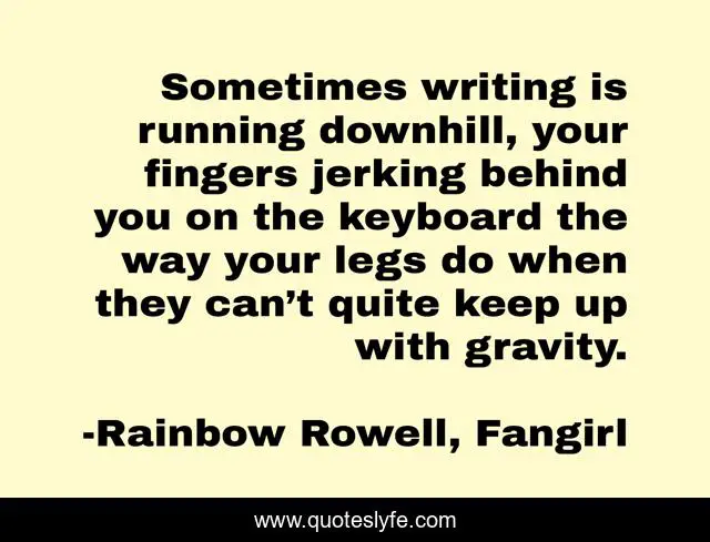 This page presents the quote "Sometimes writing is running downhill, your fingers jerking behind you on the keyboard the way your legs do when they can’t quite keep up with gravity.". Author of this quote is Rainbow Rowell, Fangirl. .