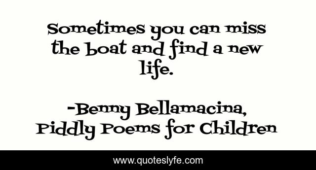 This page presents the quote "Sometimes you can miss the boat and find a new life.". Author of this quote is Benny Bellamacina, Piddly Poems for Children. This quote is about quote, life, philosophical, optimism, wisdom,.