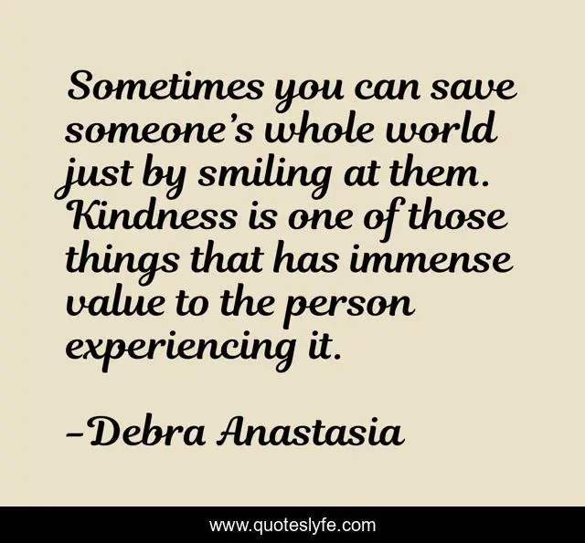 This page presents the quote "Sometimes you can save someone’s whole world just by smiling at them. Kindness is one of those things that has immense value to the person experiencing it.". Author of this quote is Debra Anastasia. This quote is about beckett-taylor, love, debra-anastasia, return-to-poughkeepsie, poughkeepsie, poughkeepsie-brotherhood, affection, smile, happiness,.