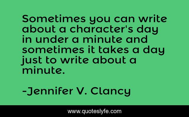 This page presents the quote "Sometimes you can write about a character's day in under a minute and sometimes it takes a day just to write about a minute.". Author of this quote is Jennifer V. Clancy. This quote is about writing, novelist, writer, novels, time,.