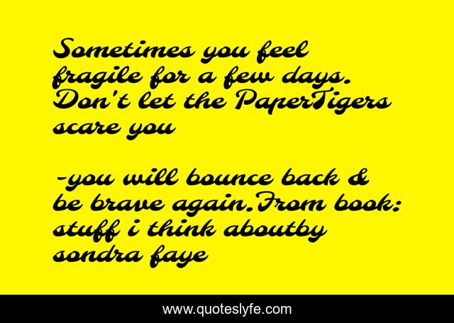 This page presents the quote "Sometimes you feel fragile for a few days. Don't let the PaperTigers scare you". Author of this quote is you will bounce back & be brave again.From book: stuff i think aboutby sondra faye. .