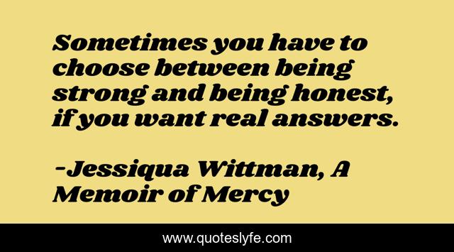 This page presents the quote "Sometimes you have to choose between being strong and being honest, if you want real answers.". Author of this quote is Jessiqua Wittman, A Memoir of Mercy. This quote is about choice, strength, honesty, answers, reality,.