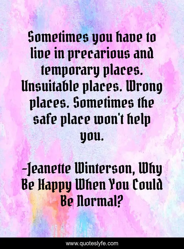 This page presents the quote "Sometimes you have to live in precarious and temporary places. Unsuitable places. Wrong places. Sometimes the safe place won't help you.". Author of this quote is Jeanette Winterson, Why Be Happy When You Could Be Normal?. This quote is about living, inspirational, enthusiasm,.