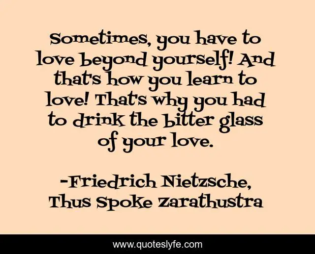 This page presents the quote "Sometimes, you have to love beyond yourself! And that's how you learn to love! That's why you had to drink the bitter glass of your love.". Author of this quote is Friedrich Nietzsche, Thus Spoke Zarathustra. This quote is about pride, love, affection,.