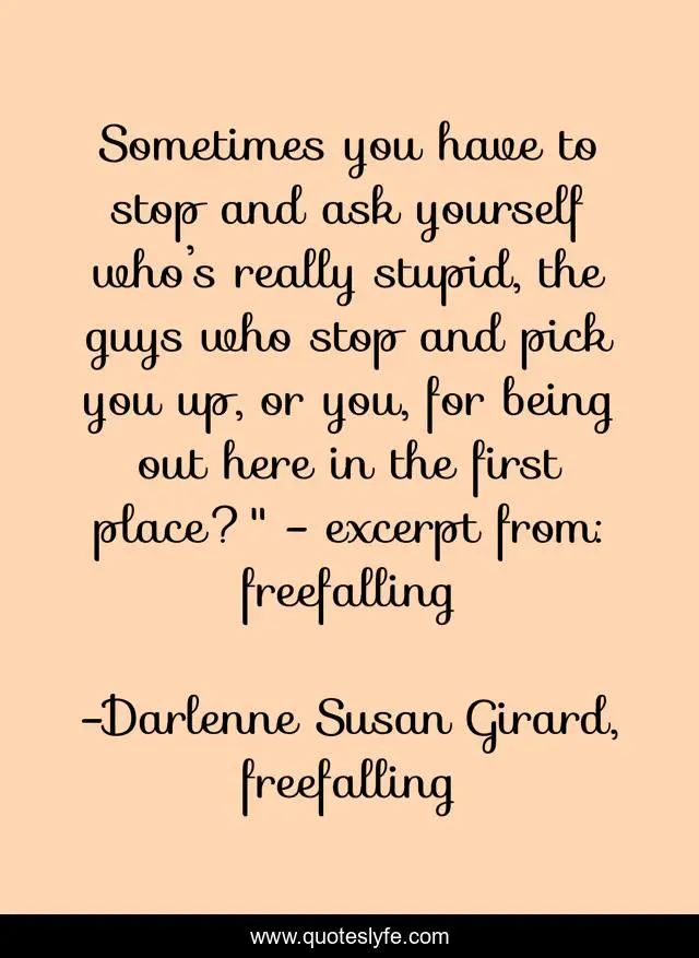 This page presents the quote "Sometimes you have to stop and ask yourself who’s really stupid, the guys who stop and pick you up, or you, for being out here in the first place?" - excerpt from: freefalling". Author of this quote is Darlenne Susan Girard, freefalling. This quote is about street-kids, abuse, draugs, prostitution,.
