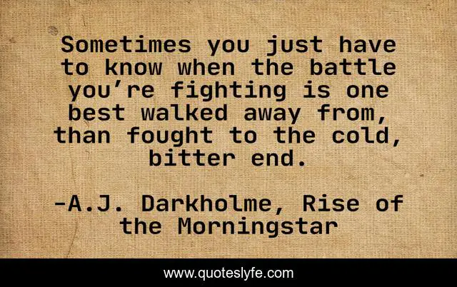 This page presents the quote "Sometimes you just have to know when the battle you’re fighting is one best walked away from, than fought to the cold, bitter end.". Author of this quote is A.J. Darkholme, Rise of the Morningstar. This quote is about time-management, careful, risk, lead, failure, leading, acceptance, success, preservation,.