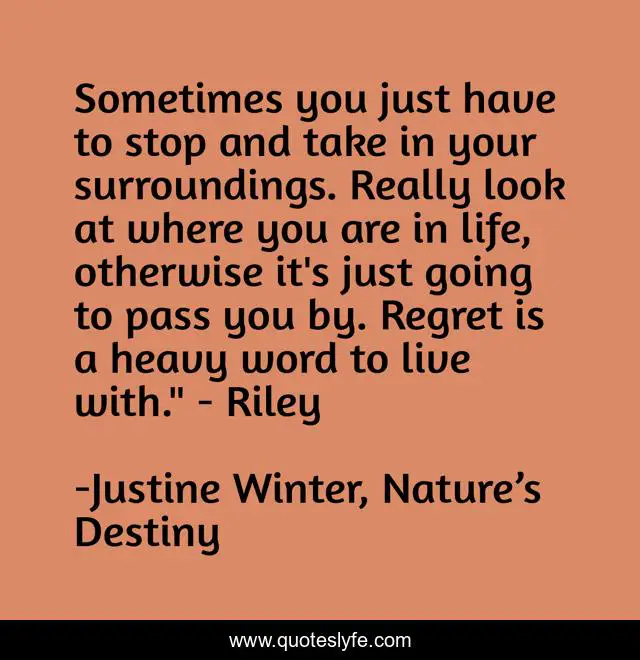 This page presents the quote "Sometimes you just have to stop and take in your surroundings. Really look at where you are in life, otherwise it's just going to pass you by. Regret is a heavy word to live with." - Riley". Author of this quote is Justine Winter, Nature’s Destiny. This quote is about life, perspective,.