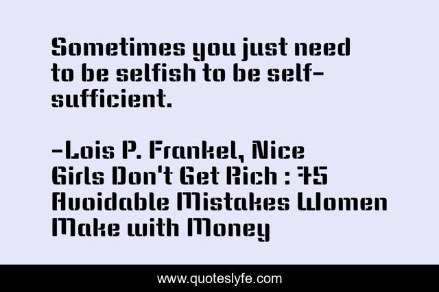 This page presents the quote "Sometimes you just need to be selfish to be self-sufficient.". Author of this quote is Lois P. Frankel, Nice Girls Don't Get Rich : 75 Avoidable Mistakes Women Make with Money. This quote is about money, self-care,.