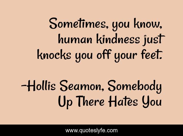 "Hollis Seamon, Somebody Up There Hates You Quotes." Quoteslyfe.com, 2025. Sat. 06 Dec. 2025. <https://www.quoteslyfe.com/quote/Sometimes-you-know-human-kindness-just-knocks-136705>.