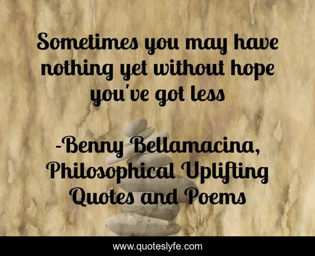 This page presents the quote "Sometimes you may have nothing yet without hope you've got less". Author of this quote is Benny Bellamacina, Philosophical Uplifting Quotes and Poems. This quote is about materialism, hope, wisdom-inspirational, optimism, wealth,.