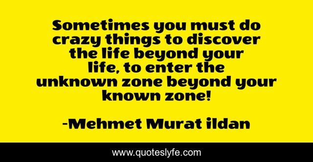 This page presents the quote "Sometimes you must do crazy things to discover the life beyond your life, to enter the unknown zone beyond your known zone!". Author of this quote is Mehmet Murat ildan. This quote is about crazy, beyond, mehmet-murat-ildan, ildan-wise-sayings, craziness, ildan-wisdom, unknown, turkish, turkish-playwrights,.