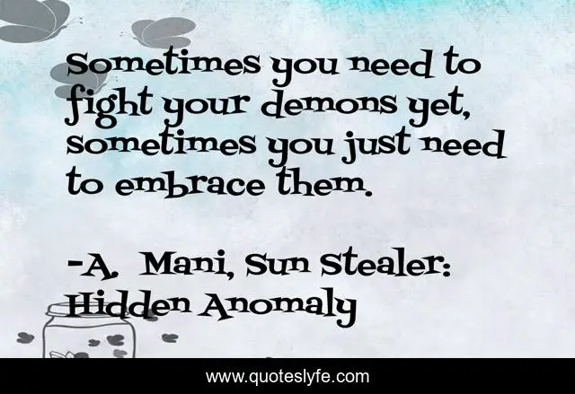 This page presents the quote "Sometimes you need to fight your demons yet, sometimes you just need to embrace them.". Author of this quote is A. Mani, Sun Stealer: Hidden Anomaly. This quote is about confidence, positive, motivational, optimistic, inspirational, life-philosophy, enthusiasm,.