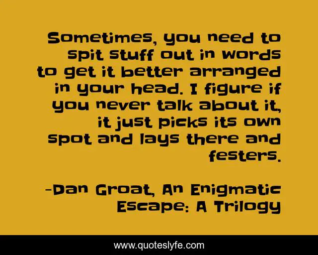 This page presents the quote "Sometimes, you need to spit stuff out in words to get it better arranged in your head. I figure if you never talk about it, it just picks its own spot and lays there and festers.". Author of this quote is Dan Groat, An Enigmatic Escape: A Trilogy. This quote is about communication, talk, words,.