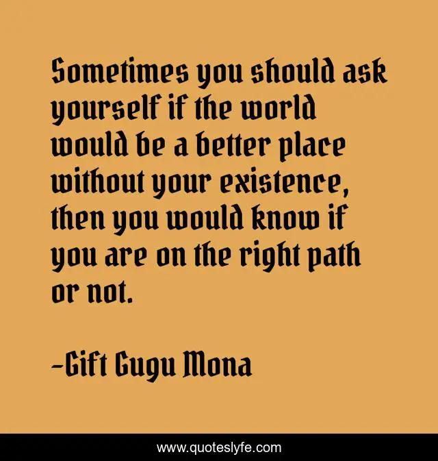 This page presents the quote "Sometimes you should ask yourself if the world would be a better place without your existence, then you would know if you are on the right path or not.". Author of this quote is Gift Gugu Mona. This quote is about ask, better-place, right-path, knowledge, world,.