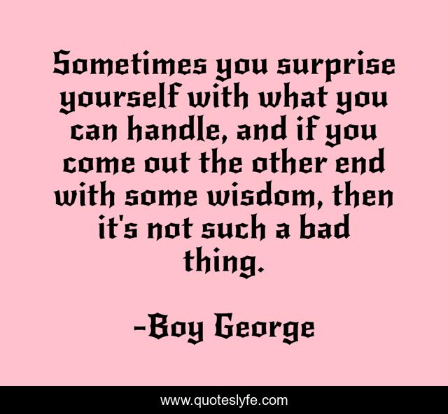 This page presents the quote "Sometimes you surprise yourself with what you can handle, and if you come out the other end with some wisdom, then it's not such a bad thing.". Author of this quote is Boy George. This quote is about surprise, end, yourself,.