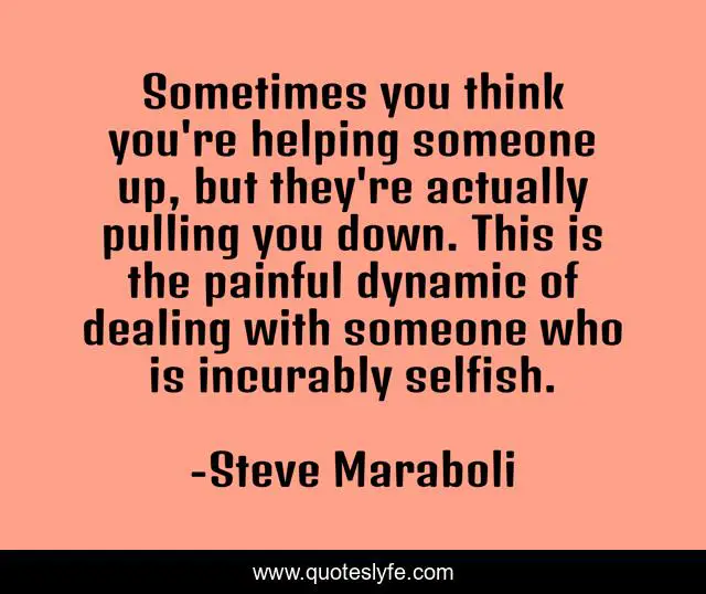 This page presents the quote "Sometimes you think you're helping someone up, but they're actually pulling you down. This is the painful dynamic of dealing with someone who is incurably selfish.". Author of this quote is Steve Maraboli. This quote is about helping, relationships, selfishness,.
