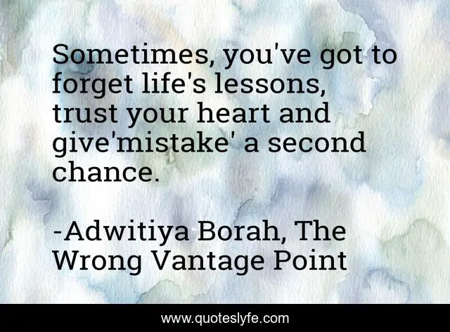 This page presents the quote "Sometimes, you've got to forget life's lessons, trust your heart and give'mistake' a second chance.". Author of this quote is Adwitiya Borah, The Wrong Vantage Point. This quote is about heart, lesson, trust, second-chance, mistake,.