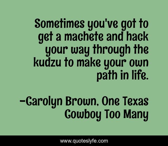 This page presents the quote "Sometimes you've got to get a machete and hack your way through the kudzu to make your own path in life.". Author of this quote is Carolyn Brown, One Texas Cowboy Too Many. This quote is about cowboy-romance, western-romance, texas-romance, contemporary-romance,.