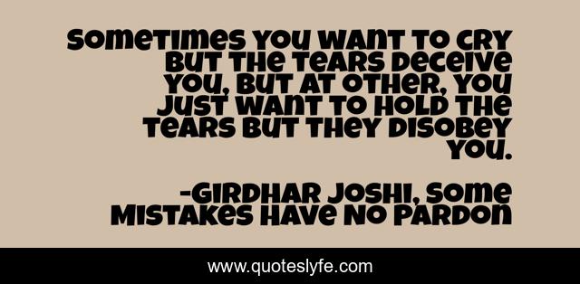 This page presents the quote "Sometimes you want to cry but the tears deceive you, but at other, you just want to hold the tears but they disobey you.". Author of this quote is Girdhar Joshi, Some Mistakes Have No Pardon. This quote is about disobey, cry, tears, deceive,.