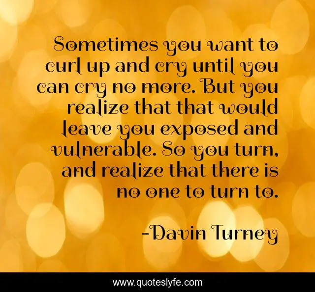 This page presents the quote "Sometimes you want to curl up and cry until you can cry no more. But you realize that that would leave you exposed and vulnerable. So you turn, and realize that there is no one to turn to.". Author of this quote is Davin Turney. This quote is about alone, crying,.