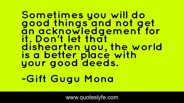 This page presents the quote "Sometimes you will do good things and not get an acknowledgement for it. Don't let that dishearten you, the world is a better place with your good deeds.". Author of this quote is Gift Gugu Mona. This quote is about dishearten, acknowledgement, better-place, world, good-deeds, good-things,.