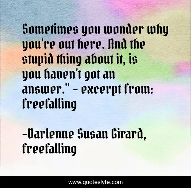 This page presents the quote "Sometimes you wonder why you’re out here. And the stupid thing about it, is you haven’t got an answer." - excerpt from: freefalling". Author of this quote is Darlenne Susan Girard, freefalling. .