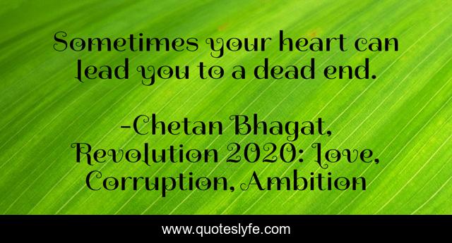 This page presents the quote "Sometimes your heart can lead you to a dead end.". Author of this quote is Chetan Bhagat, Revolution 2020: Love, Corruption, Ambition. This quote is about heart, life-lessons,.