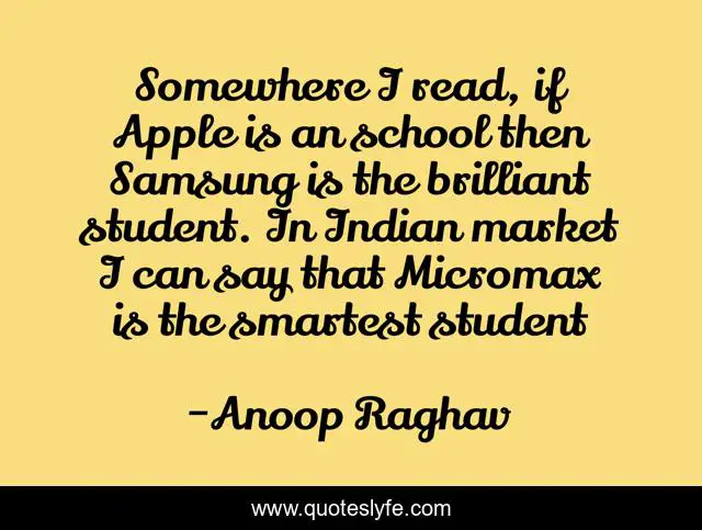 This page presents the quote "Somewhere I read, if Apple is an school then Samsung is the brilliant student. In Indian market I can say that Micromax is the smartest student". Author of this quote is Anoop Raghav. This quote is about gadgets, samsung-galaxy-latest-releases, technology, iphone,.