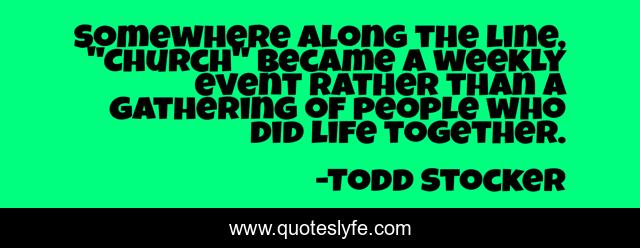 This page presents the quote "Somewhere along the line, "Church" became a weekly event rather than a gathering of people who did life together.". Author of this quote is Todd Stocker. This quote is about life-together, gathering, church,.