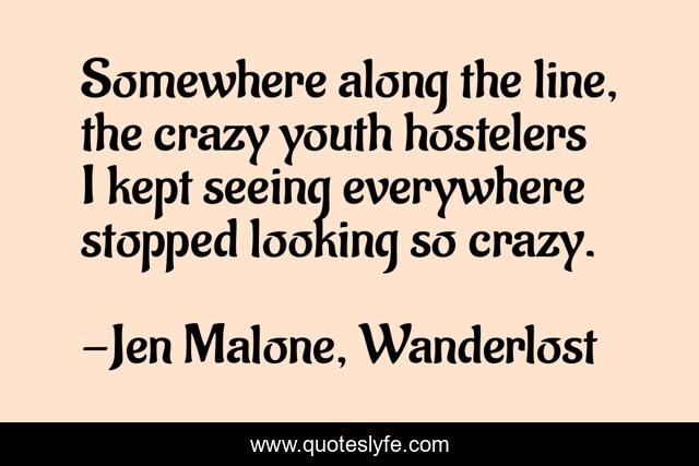 This page presents the quote "Somewhere along the line, the crazy youth hostelers I kept seeing everywhere stopped looking so crazy.". Author of this quote is Jen Malone, Wanderlost. This quote is about enthusiasm, travel, inspirational, wanderlost,.