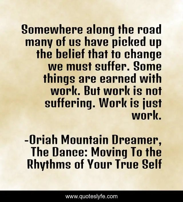 This page presents the quote "Somewhere along the road many of us have picked up the belief that to change we must suffer. Some things are earned with work. But work is not suffering. Work is just work.". Author of this quote is Oriah Mountain Dreamer, The Dance: Moving To the Rhythms of Your True Self. This quote is about enthusiasm, suffering, work, change, inspirational,.