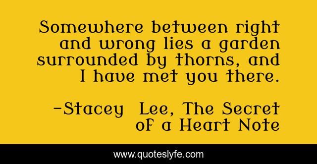This page presents the quote "Somewhere between right and wrong lies a garden surrounded by thorns, and I have met you there.". Author of this quote is Stacey Lee, The Secret of a Heart Note. This quote is about ya, love, garden, affection,.
