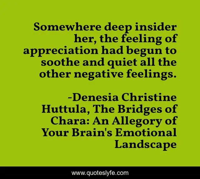 This page presents the quote "Somewhere deep insider her, the feeling of appreciation had begun to soothe and quiet all the other negative feelings.". Author of this quote is Denesia Christine Huttula, The Bridges of Chara: An Allegory of Your Brain's Emotional Landscape. .