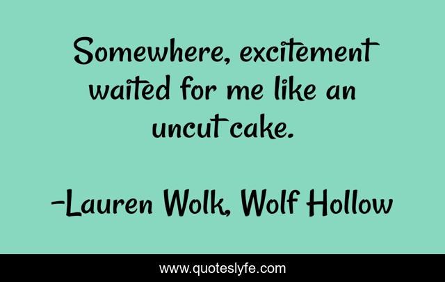 This page presents the quote "Somewhere, excitement waited for me like an uncut cake.". Author of this quote is Lauren Wolk, Wolf Hollow. This quote is about future, humor, hope,.
