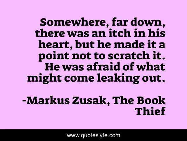 This page presents the quote "Somewhere, far down, there was an itch in his heart, but he made it a point not to scratch it. He was afraid of what might come leaking out.". Author of this quote is Markus Zusak, The Book Thief. .