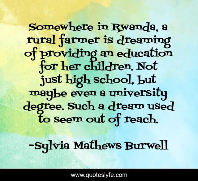 This page presents the quote "Somewhere in Rwanda, a rural farmer is dreaming of providing an education for her children. Not just high school, but maybe even a university degree. Such a dream used to seem out of reach.". Author of this quote is Sylvia Mathews Burwell. This quote is about school, children,.