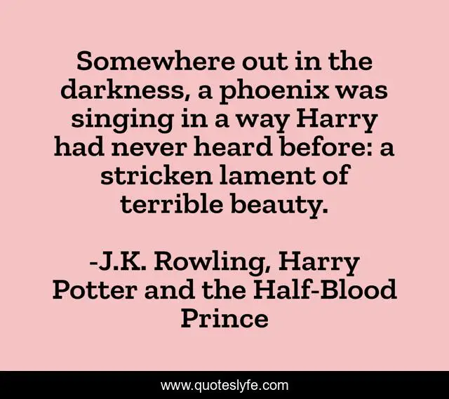 This page presents the quote "Somewhere out in the darkness, a phoenix was singing in a way Harry had never heard before: a stricken lament of terrible beauty.". Author of this quote is J.K. Rowling, Harry Potter and the Half-Blood Prince. This quote is about beauty, light, darkness, phoenix, song,.